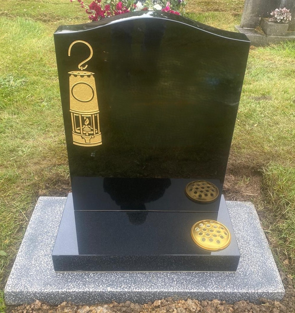 Classic ogee top headstone with a gold miners lamp engraved top left .We can engrave the Miners number or surname in the