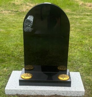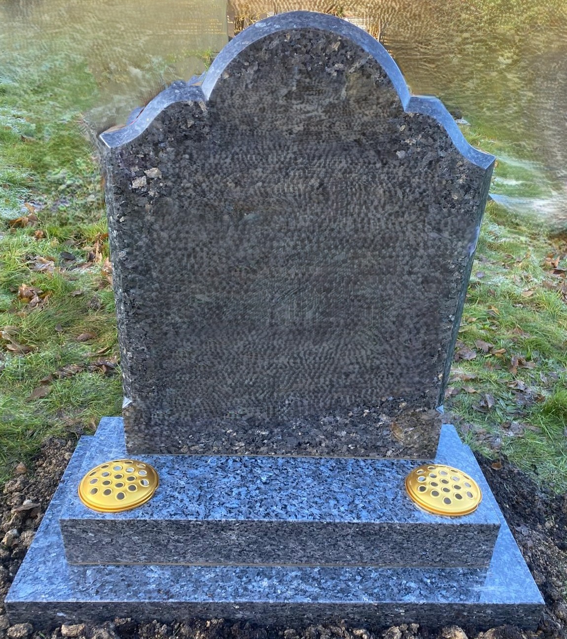 This Blue pearl memorial comes with a matching blue pearl foundation base and two gold flower containers. Designs can be added at extra cost.